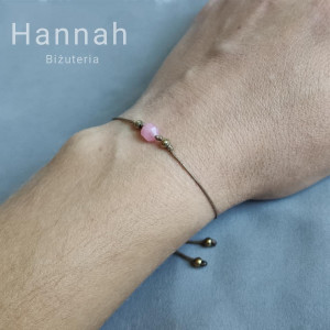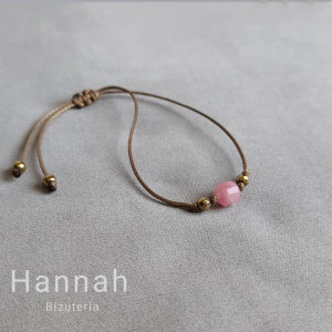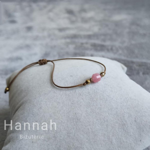 Bransoletka z kamieniem naturalnym - RODOCHROZYT to kompozycja pełna kobiecości, wdzięku. Barwy kamienia to delikatny róż, który w połączeniu z brązem sznurka tworzy harmonijny duet, natomiast dopełnieniem całości są użyte po bokach kamienie hematytu w kolorze złotym.