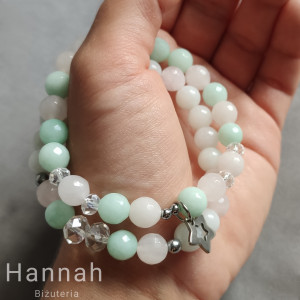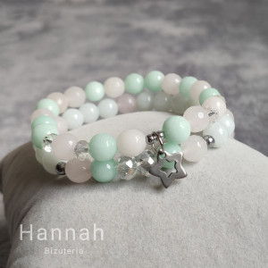 Prezentowany model to połączenie dwóch bransoletek w pastelowych barwach, łączących delikatny róż oraz miętę. Jako dodatki zostały dobrane zawieszka gwiazdki oraz szklane koraliki pięknie odbijające światło.