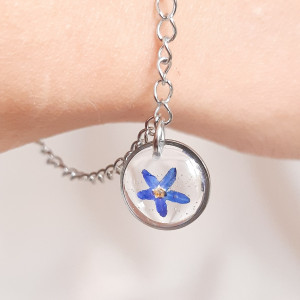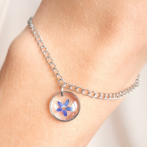 Subtelna bransoletka z wiszącą zawieszką, w której zatopiony został prawdziwy kwiat Niezapominajki. W oprawie ze stali chirurgicznej w kolorze srebra tworzy wyraz kobiecej elegancji. Ta niepowtarzalna bransoletka doda szyku i niewymownej ulotności każdej stylizacji. Na kobiecym nadgarstku prezentuje się przepięknie, dzięki czemu zatrzymuje wzrok na dłużej, budzi zachwyt i ciekawość swoją wyjątkowością. Została wykonana ręcznie, co czyni ją bezcenną.