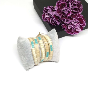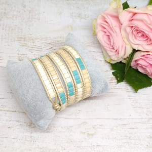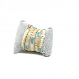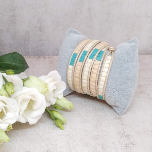 Kobieca bransoletka w kolorach kremowym i turkusowym - idealny dodatek do letnich i jesiennych kreacji w stylu boho. Doskonale sprawdzi się także do sportowych zestawów i w biurowych stylizacjach.