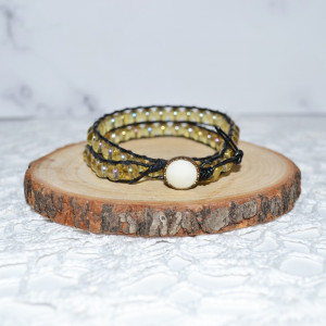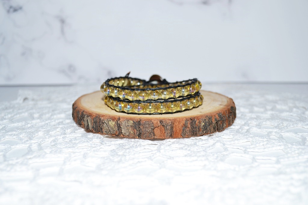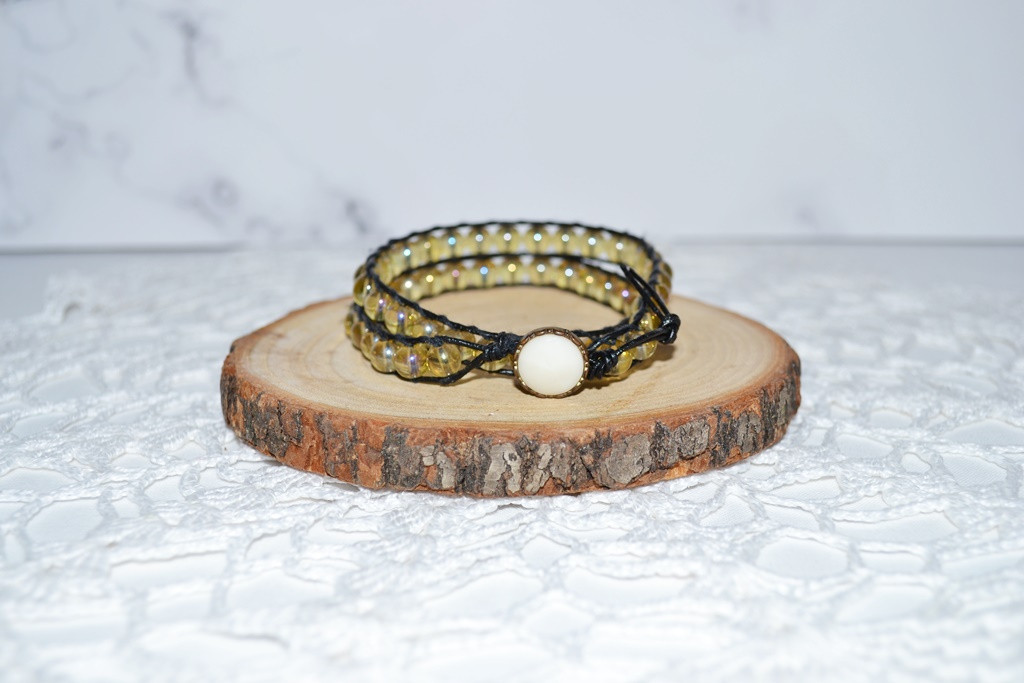 Bransoletka wykonana z rzemyka ekologicznego oraz szklanych koralików, zapinanie na metalowy guzik