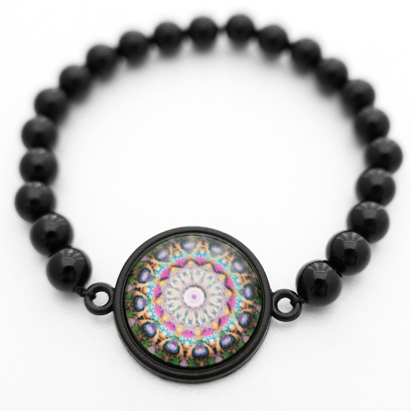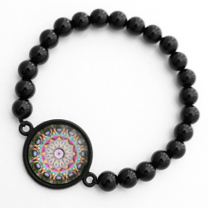 Ręcznie przygotowana bransoletka z kamieni czarnego onyksu (6mm) szlifowanych na wysoki połysk, nawleczonych na elastyczny sznurek. Mandala przykryta wypukłym, polerowanym szkiełkiem, co nadaje jej blasku oraz wzbogaca o efekt trójwymiarowości.
