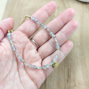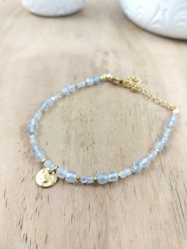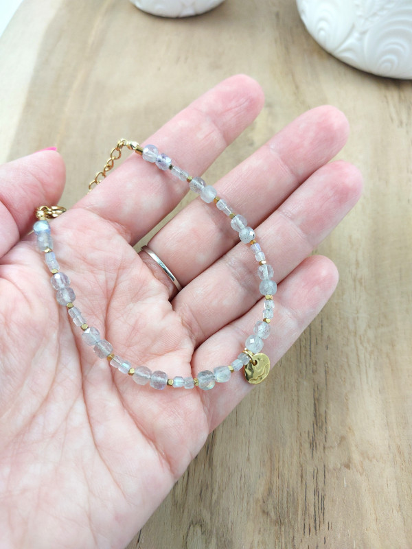 Bransoletka jest wykonana z kamieni półszlachetnych (labradoryt), przekładki są z hematytów natomiast elemanty metalowe to stal chirurgiczna.