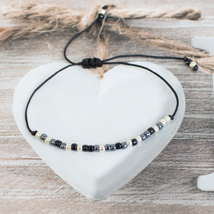 Bransoletka z kodem Morse’a wykonana ręcznie z japońskich koralików Toho z nieścieralną powłoką oraz mocnego cienkiego sznurka nylonowego z przesuwnym zapięciem makramowym. Sznurek nie zmienia koloru, nie blaknie, nie rozciąga się, nie przeciera, posłuży długo. Każda literka napisu Cat Lady zakodowana jest kodem Morse’a: srebrny koralik kreska, grafitowy kropka, czarny przerwa, dwa czarne przerwa między wyrazami.
