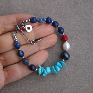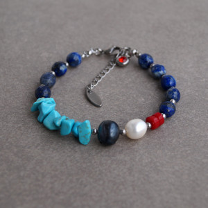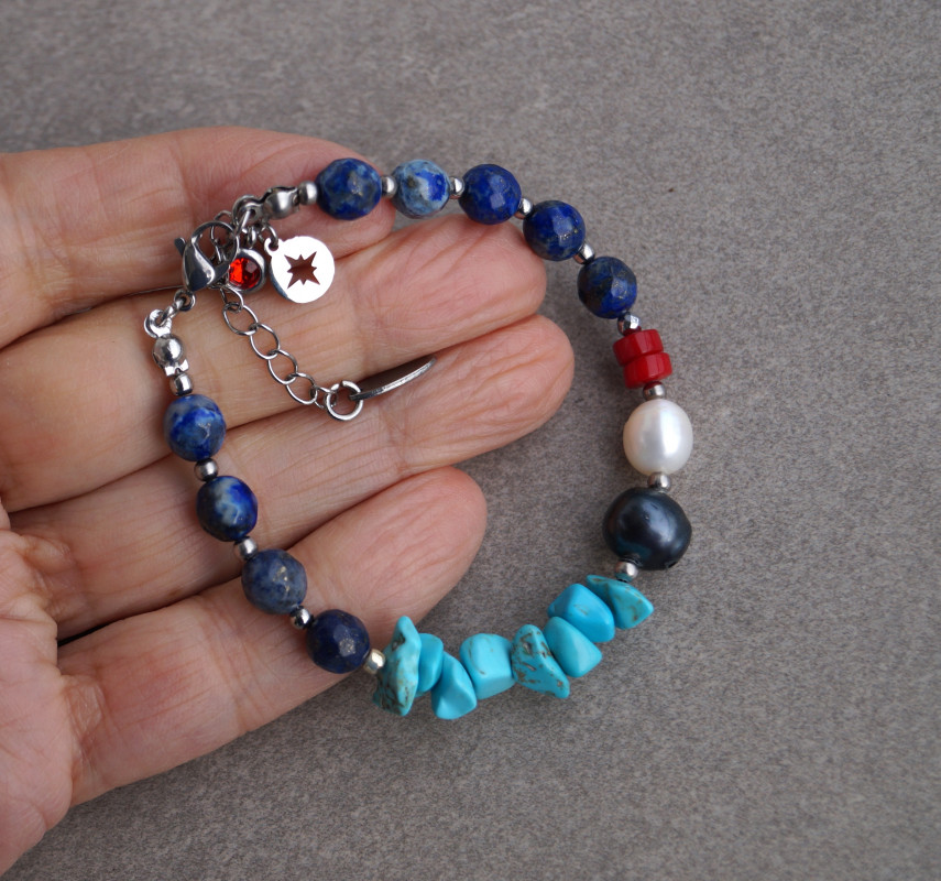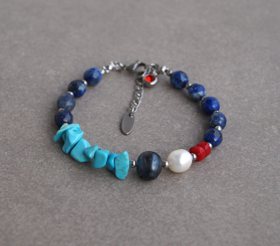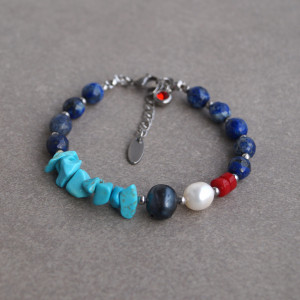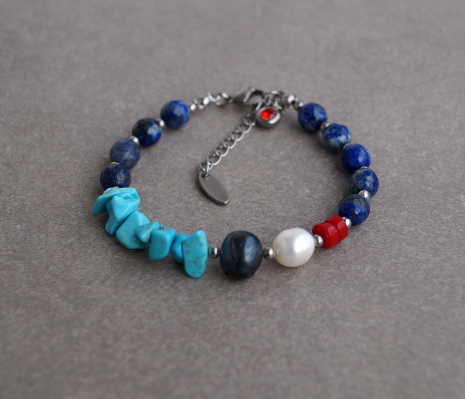 Delikatna i elegancka bransoletka wykonana z naturalnych kamieni - lapis lazuli(8 mm), perła naturalna granatowa (10 mm), perła naturalna biała(8 mm), koral czerwony (4 mm),howlit niebieski. Zapinana na karabińczyk ze stali szlachetnej (plus łańcuszek regulacyjny). Długość bransoletki: ok.18 cm, pasuje na nadgarstek 15,5 -17,5 cm. Każda zamawiana biżuteria z kamieni naturalnych jest jedyna w swoim rodzaju i może nieco różnić się kolorem od prezentowanej na zdjęciach. Zapakowana w woreczek z organzy.