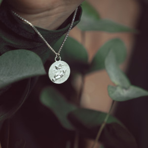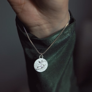 Medalik jest dwustronny - z jednej strony jest symboliczna dłoń z piórkiem, a z drugiej trójkąt, alchemiczny znak tego Żywiołu. Wykonany z wysokiej próby srebra 925.