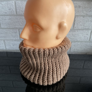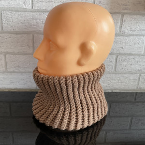 Ciepły komin zakładany przez głowę wykonany ręcznie z włóczki dodatkiem wełny Merino.