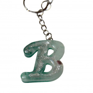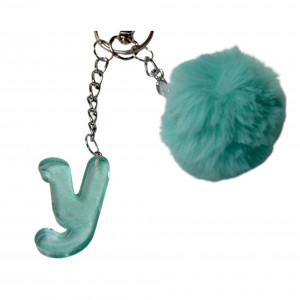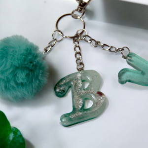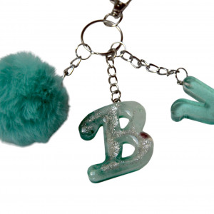 Litera oraz dodatkowa przywieszka zostały wykonane z zabarwionej żywicy epoksydowej, ozdobionej brokatem, pomponik, kółeczko i łańcuszki – ze stopu cynku w kolorze srebrnym.