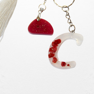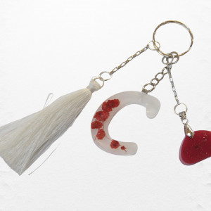 Litera oraz dodatkowa przywieszka zostały wykonane z zabarwionej żywicy epoksydowej, ozdobionej zasuszonymi kwiatkami, brokatem, chwost z nitek wiskozowych, kółeczko i łańcuszki – ze stopu cynku w kolorze srebrnym.