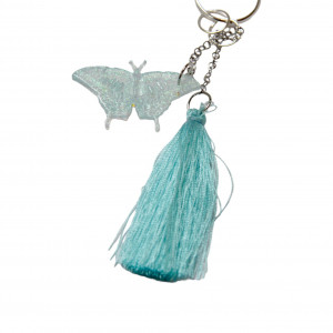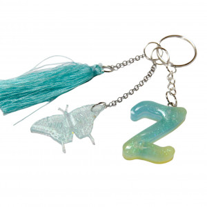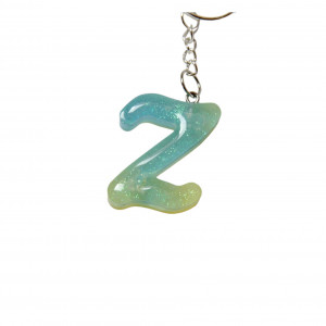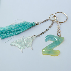 Litera oraz dodatkowa przywieszka zostały wykonane z zabarwionej żywicy epoksydowej, ozdobionej zasuszonymi kwiatkami, brokatem, chwost z nitek wiskozowych, kółeczko i łańcuszki – ze stopu cynku w kolorze srebrnym.