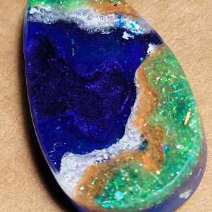 Jego element główny jest własnoręcznie zrobiony z żywicy epoksydowej z dodaniem pyłków różnych odcieni na rożnych etapach pracy dla odzyskania efektu warsw i głęmbi.