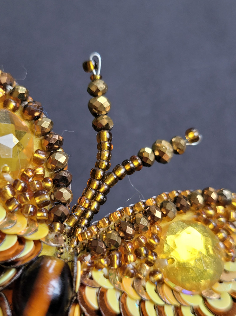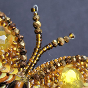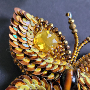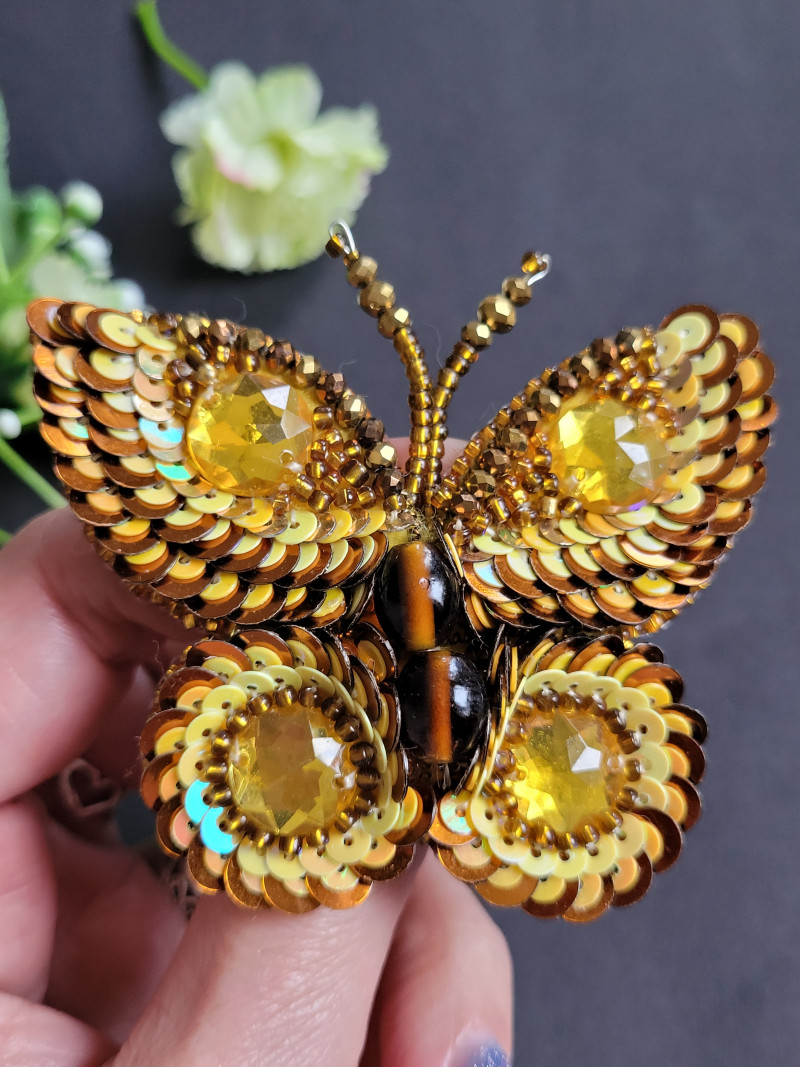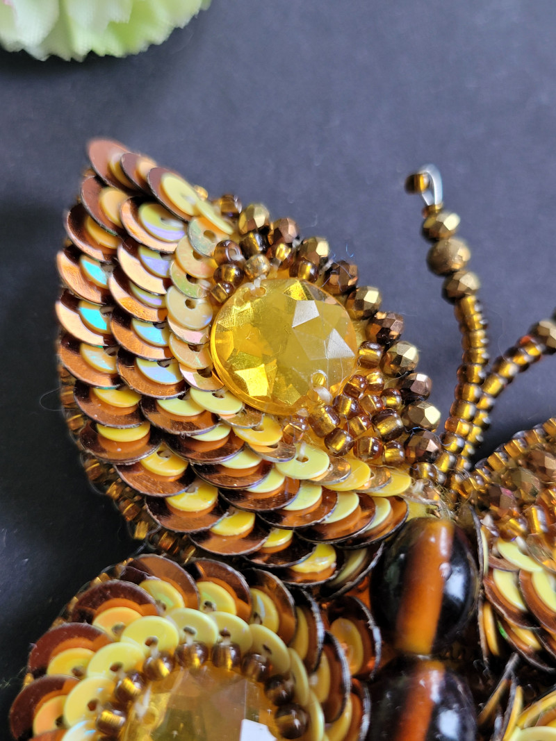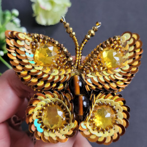 Broszka "Motyl żółto-brązowy" haftowana koralikami i cekinami