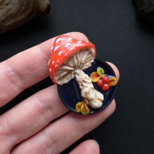 Autorska trójwymiarowa broszka modelowana ręcznie z glinki polimerowej techniką mikrorzeźby. Przedstawia ona muchomora oglądanego „od spodu” – z misternie wyrzeźbionymi blaszkami, mięsistym trzonem i kapeluszem w kolorze jasnej czerwieni z białymi kropkami. Na czarnym, połyskującym tle umieściłam miniaturowe jesienne listki i kulki czerwonego korala naturalnego w roli czerwonych jagód.