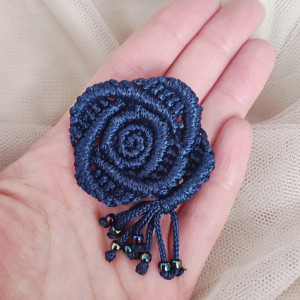 Broszka jest ręcznie pleciona, ozdobiona koralikami.
