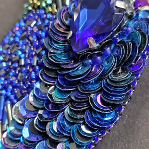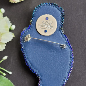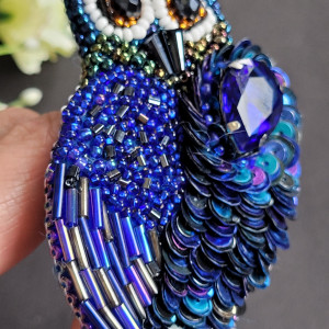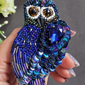 Broszka "Sowa granatowa" haftowana koralikami i cekinami