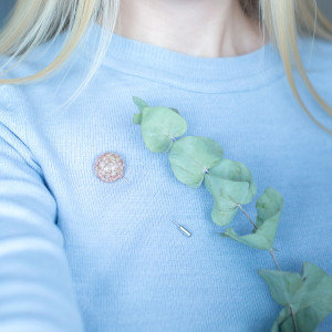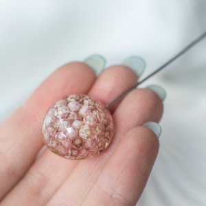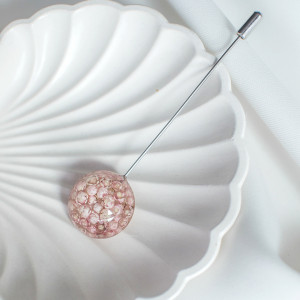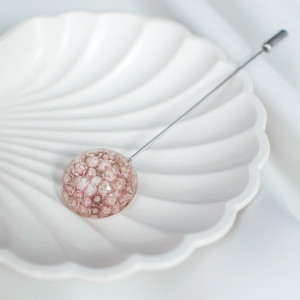 Broszka wykonana jest z żywicy epoksydowej z wykorzystaniem suszonych kwiatów. Metalowe elementy to stal nierdzewna szlachetna chirurgiczna