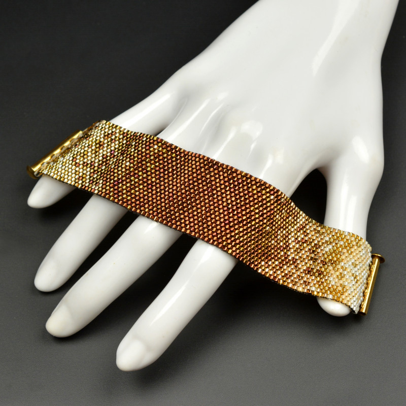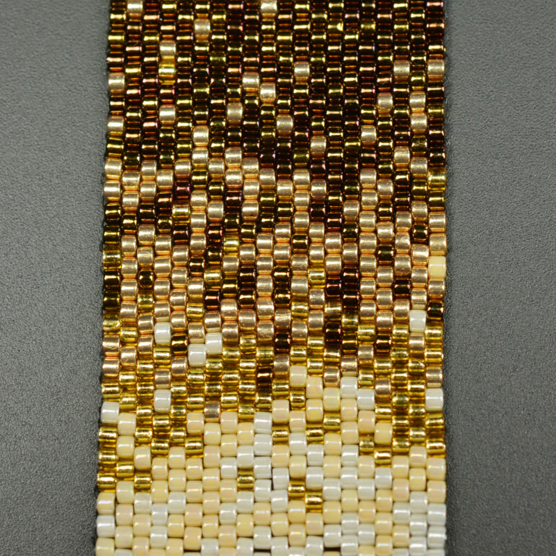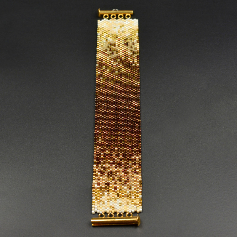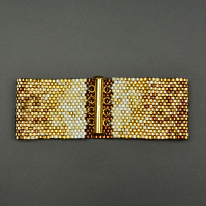 Koraliki mają cylindryczny kształt, dzięki czemu wpasowują się między siebie jak cegiełki, a bransoletka wbrew pozorom nie jest sztywna - przeciwnie, układa się na nadgarstku miękko jak tkanina. Użyłam koralików o różnych błyszczących powłokach - metalicznych bądź opalizujących - dzięki temu bransoleta "żyje", przy każdym ruchu światło wydobywa z niej inne migotanie. Nie sposób oddać tego na zdjęciach.