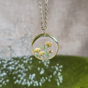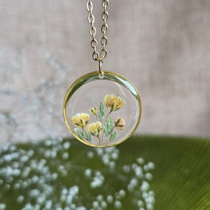 Oferuję Państwu unikalną biżuterię. Zawieszka jest wykonana z suszonych kwiatów i żywicy epoksydowej. Biżuteria jest wspaniałym i oryginalnym prezentem na lata. Do utrwalenia roślin stosuję żywicę jubilerską najwyższej jakości.