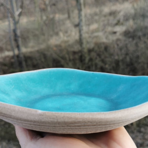 Ceramiczna misa (głęboki talerz) wykonana z szarej gliny. Formowana ręcznie. Wypalona dwukrotnie w piecu ceramicznym. W środku szkliwo w kolorze satynowego turkusu, ładnie współgrają z szarością surowej gliny. Szkliwa spożywcze. Idealna na orzechy, owoce i inne przekąski. Będzie piękną dekoracją stołu. Ta ceramika lubi mycie ręczne. Całość zostanie zapakowana dekoracyjnie oraz dobrze zabezpieczona na czas transportu. Wymiary średnica ok. 19cm wysokość 4cm Kolorystyka może nieznacznie się różnić, w zależności od ustawień monitora.