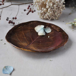 Szkliwo półtransparentne, by uwidocznić naturalnie piękne unerwienie liścia . Taka podstawka może być użyta jako stylowa mydelniczka, bądź podstawka na drobiazgi na przykład biżuterię, klucze, kadzidła lub świece.