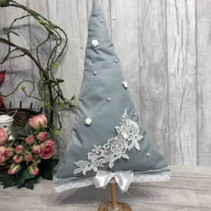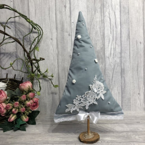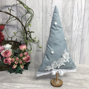 Choinka wykonana z tkaniny bawełnianej, ozdobiona dekoracjami w białym kolorze. Choinka osadzona jest na drewnianym krążku.