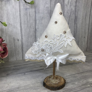 Choinka wykonana z tkaniny bawełnianej, ozdobiona kokardą oraz pięknymi dekoracjami. Choinka osadzona jest na drewnianym krążku.