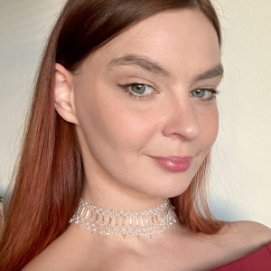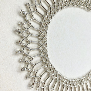 Wykonany z połyskujących metalicznych koralików w kolorze srebrnym.
