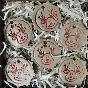 Ceramiczne ozdoby ręcznie robione ciastka z reniferami na choinkę w kształcie śnieżynek, w kolorze beżowym z czerwienią. Pięknie wyglądają na tradycyjnej choince lub w stroikach bożonarodzeniowych. Komplet zawiera 6 sztuk ciastek ceramicznych, do zestawu dołączone są sznurki bawełniane.