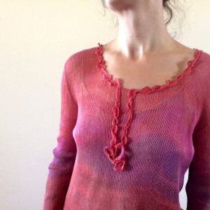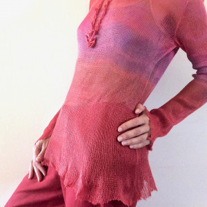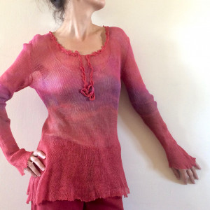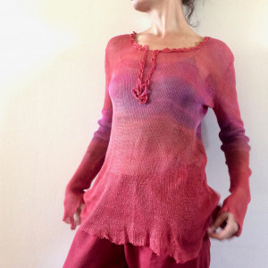 Unikatowa bluzka z falbanką lekko transparentna. Ręcznie barwiona w odcieniach czerwonego wina. Uniwersalna, na dzień do dżinsów i na wieczorne wyjście.