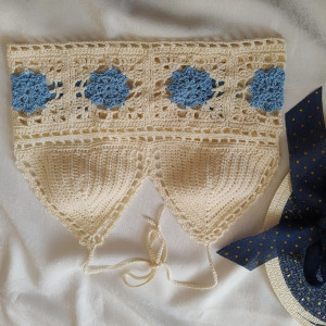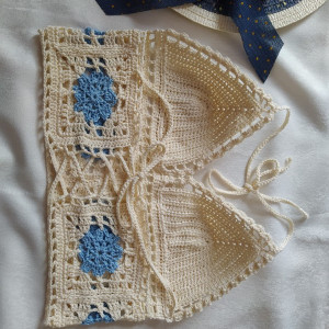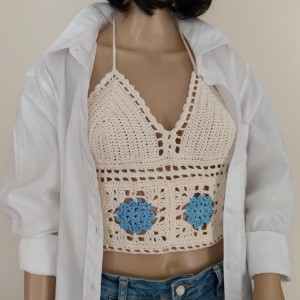 Szydełkowy crop top w stylu boho. Wykonany ze świetnej gatunkowo i miłej dla ciała 100 % bawełny, co zapewni komfort w czasie upałów, a ręczne wykonanie sprawi, że poczujesz się wyjątkowa.