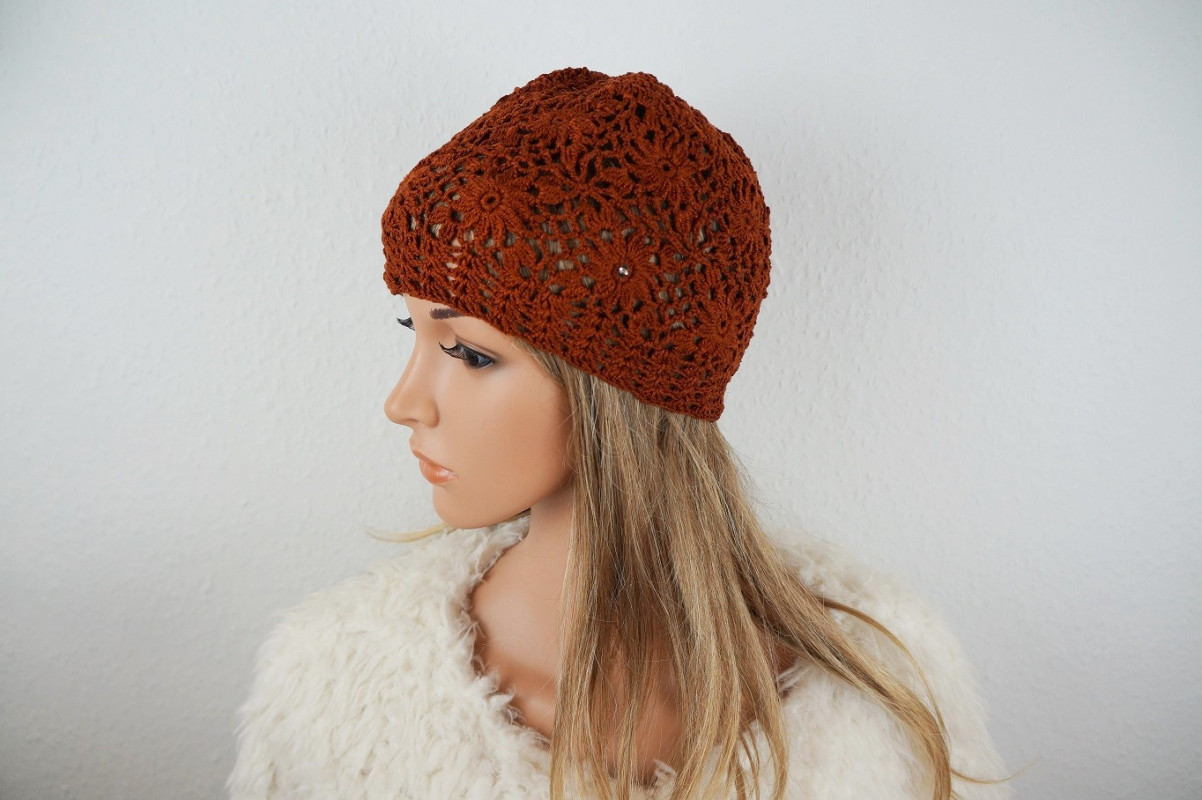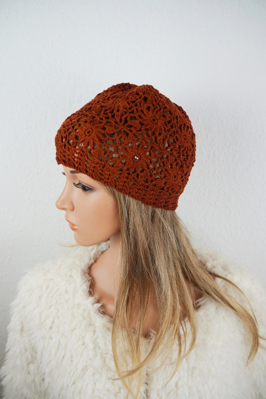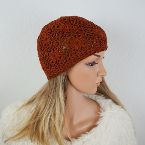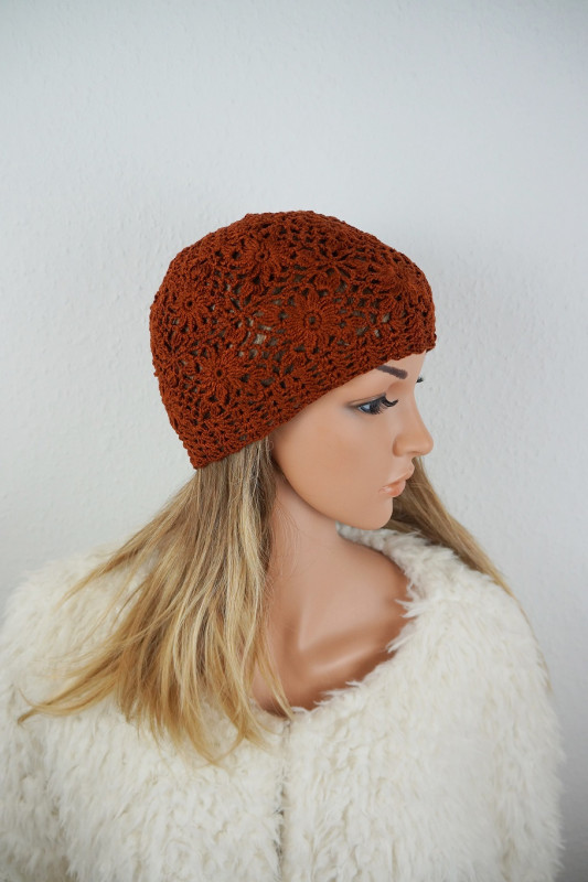 Czapkę wykonano ręcznie szydełkiem z bawełny - 100%. Wymiary czapki; głębokość - 20 cm, szer. dołu - 54, 58 cm. Czapka doskonale dopasowuje się do głowy. Proszę prać ręcznie, suszyć w stanie rozłożonym.