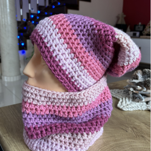Klasyczny komplet czapki smerfetki i komina. Lawendowe odcienie.