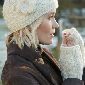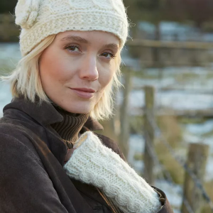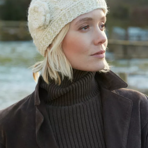 Dzięki tej eleganckiej wełnianej czapce typu beanie ogrzej głowę i wyglądaj modnie na świeżym powietrzu. Ta zimowa czapka wykonana jest w 100% z wełny w kolorze naturalnego kremu. Ma piękny warkoczowy wzór, który owija się wokół w dwóch rzędach i jest zwieńczony bardziej subtelnym wzorem dzianiny. Czapka jest wykończona fantastycznym, trójwymiarowym kwiatkiem, który znajduje się z boku.