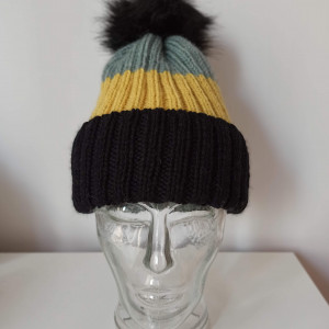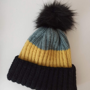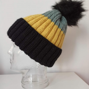 Ciepła czapka w trzech kolorach z mankietem i pomponem, dziergana ze 100% wełny.