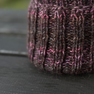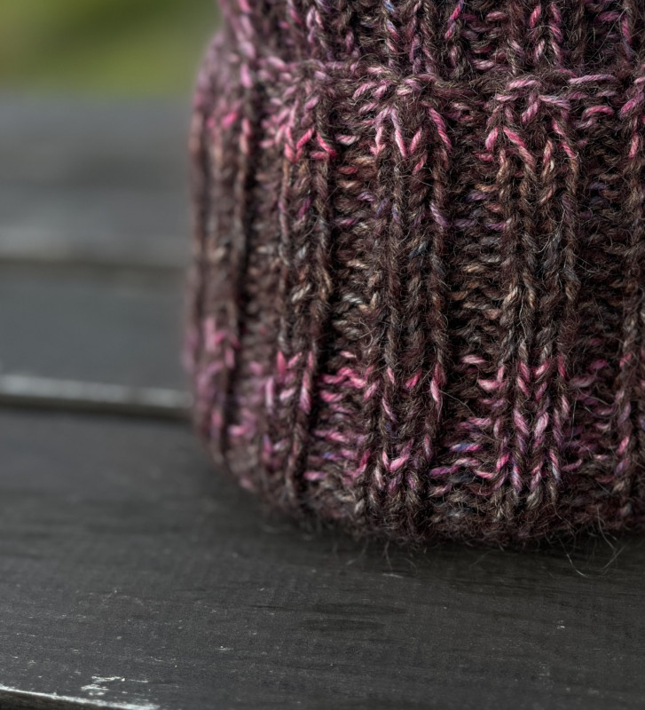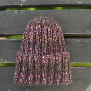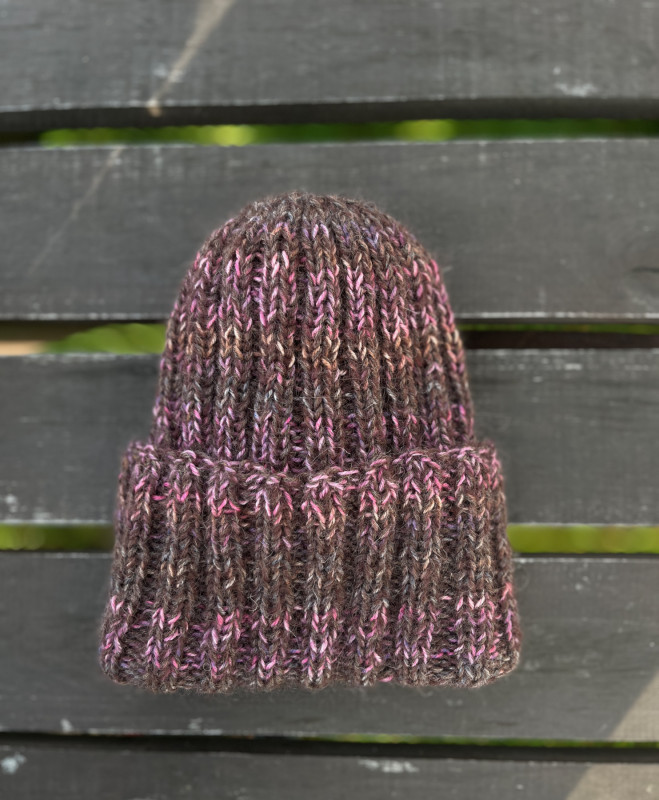 Ręcznie zrobiona czapka w stonowanym odcieniu gorzkiej czekolady, przełamanym różowym akcentem. Cieniowana włóczka nadaje wizualnej głębi – kolory delikatnie się przenikają, nie są jednolite.