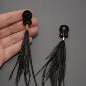 oferuję kolczyki lub klipsy zrobione haftem sutasz, ozdobione fasetowanymi kaboszonami i długimi, delikatnymi piórami