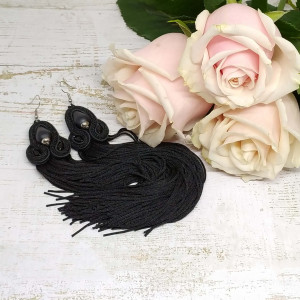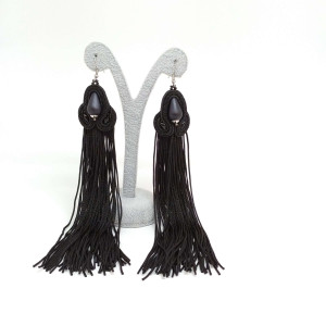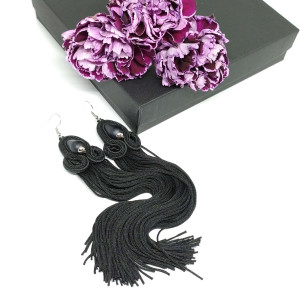 Czarne piękności, którym trudno się oprzeć. matowe, jakby o satynowym wykończeniu koraliki oplecione zostały czarnymi pasmami sutaszu z dodatkiem czarnych koralików. A wszystko to okraszone czarnymi i bardzo długimi chwostami.