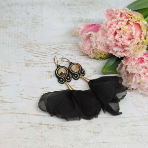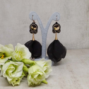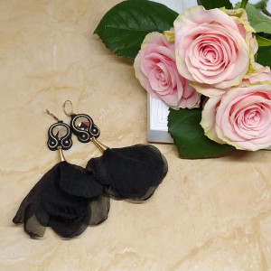 kryształki Swarovski w kolorze rose gold (różowe złoto), czarny sutasz, bigle ze stali chirurgicznej w kolorze rose gold, czarne szyfonowe kwiaty