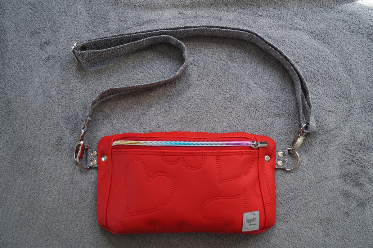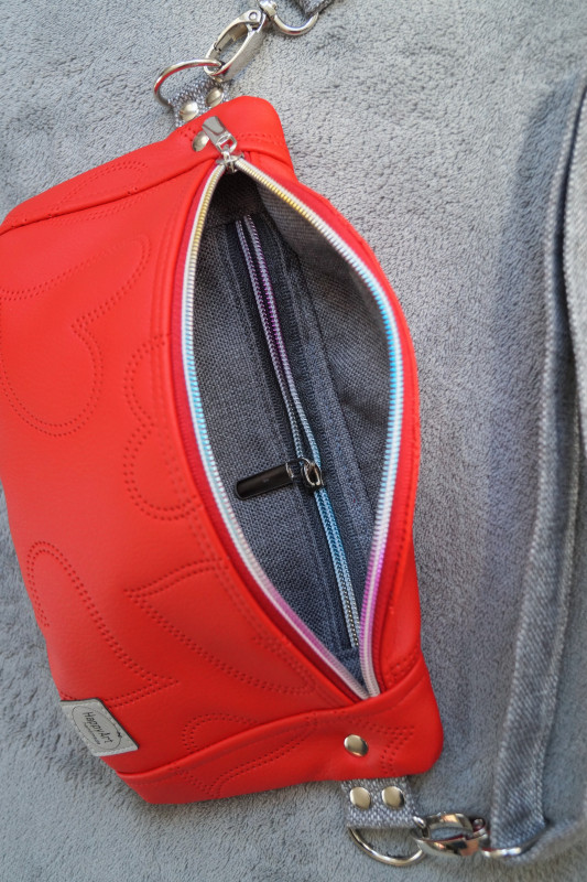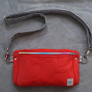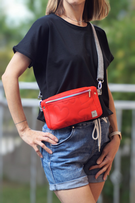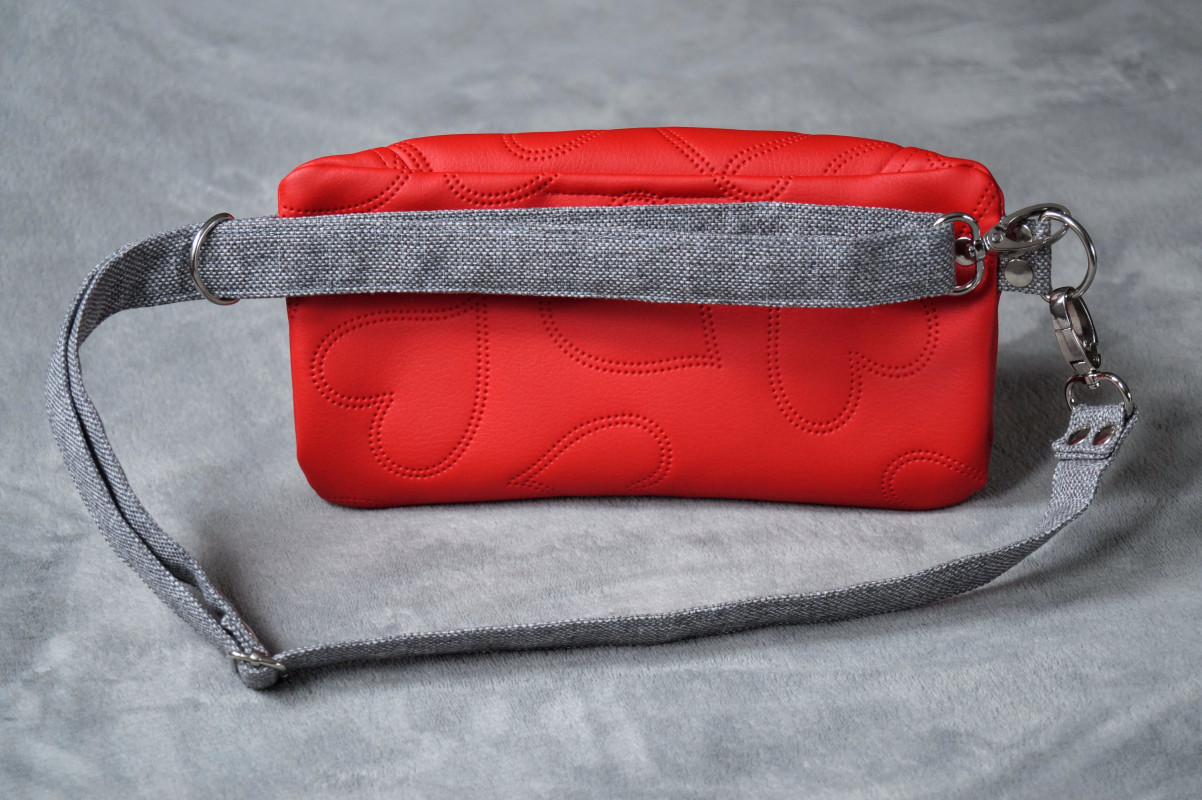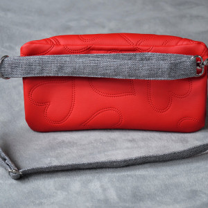 Mała, podręczna saszetka z długim odpinanym paskiem, uszyta z czerwonej pikowanej w serca skóry ekologicznej oraz z szarej melanżowej tkaniny tapicerskiej imitującej len.