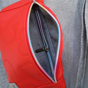 Zamykana jest na czerwony zamek błyskawiczny z tęczową spiralą.