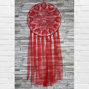 Wykonany ręcznie z bawełnianej nici. Jako zawieszka służy satynowa wstążeczka. Całość rozpięta jest na metalowej obręczy o średnicy 40 cm. Długość koronkowych "frędzli" to około 60 cm.