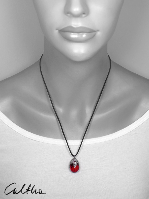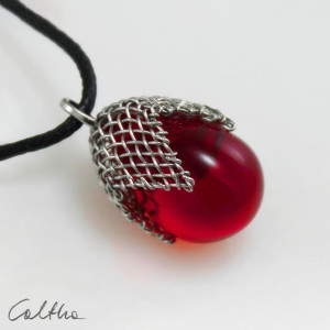Szklana kropla oprawiona w ręcznie formowaną metalową siateczkę. Całkowita wielkość wisiorka to ok. 2,5 cm. W komplecie bawełniany sznurek do zawieszenia.