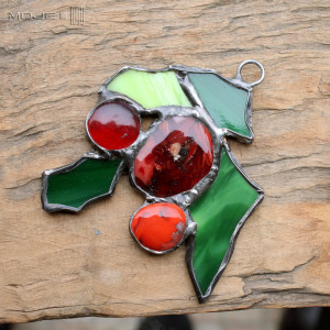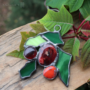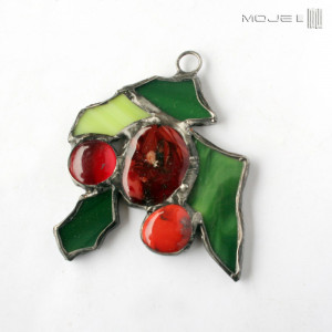 Witrażowy, zdobny dekor świąteczny bożonarodzeniowy - do powieszenia. Wykonałam go techniką Tiffany ze szkła witrażowego, wykończony jest cynowaną, patynowaną i przecieraną miedzią. Może być alternatywą dla świątecznej bombki.