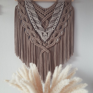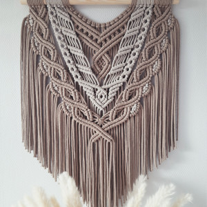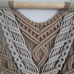 Makrama ścienna w kolorystyce barw ziemi. Będzie oryginalną dekoracją ściany. Pięknie komponuje się np. z dodatkami z gamy beżów, brązów, ecru, ale również jasnych szarości i bieli.