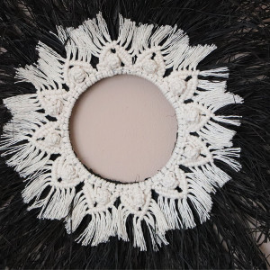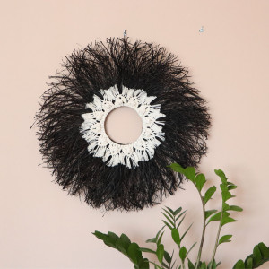 Wisząca dekoracja w kształcie koła z naturalnej rafii z wiankiem w środku wykonanym w technice makramy.
