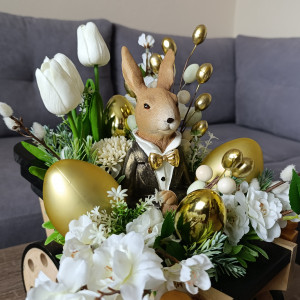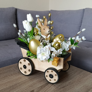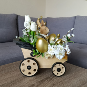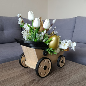 Zapraszam do zakupu wielkanocnej dekoracji w drewnianej, ręcznie robionej bryczce. Prawdziwy hit! Stroik na Wielkanoc i wiosnę z figurką eleganckiego królika, udekorowany kompozycją z kwiatów sztucznych. Dekoracja wysokiej jakości.