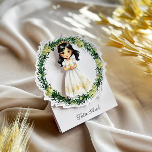 Winietka składa się z białego satynowego papieru z nadrukowanym imieniem/imieniem i nazwiskiem gości, z wianka wyciętego z białego satynowego papieru, przetrzennie przyklejonej postaci modlącej się dziewczynki.