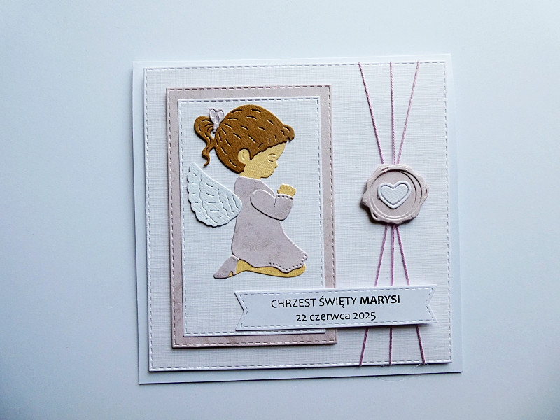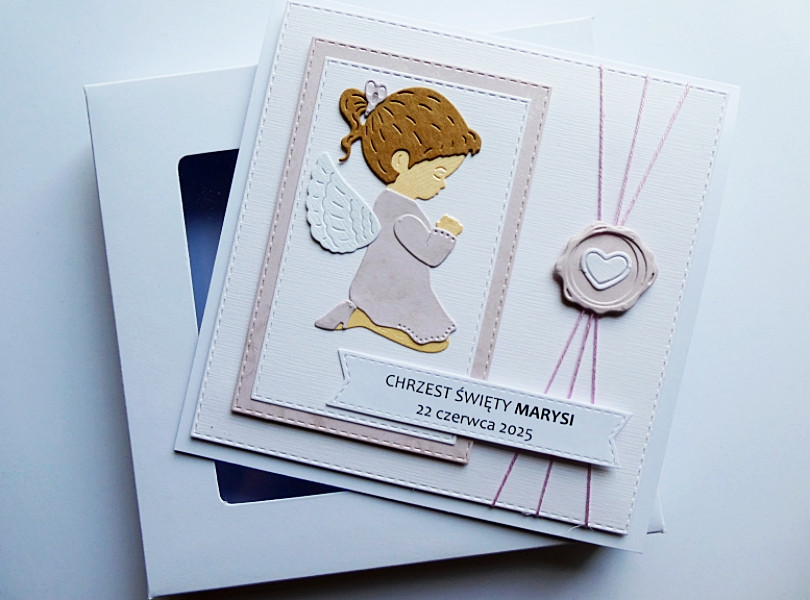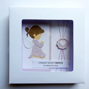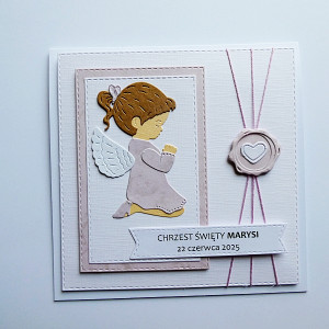 Biało-różowa kolorystyka wraz z wizerunkiem modlącego się aniołka – symbolu opieki i błogosławieństwa - sprawia, że kartka idealnie oddaje charakter uroczystości Chrztu Świętego.