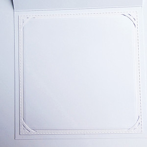 Kartka ma wklejony w środku biały karnecik, w którym umieszczona została wkładka odręcznego wypisania życzeń.