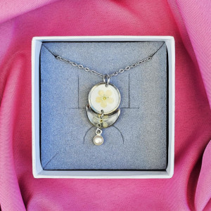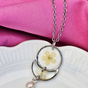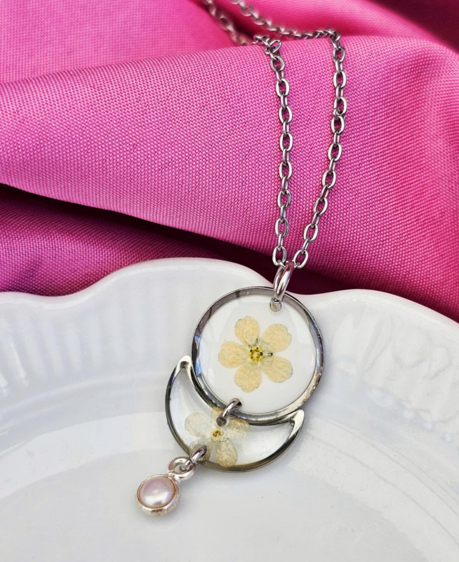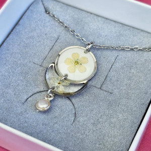 Naszyjnik z kwiatami suszonej niezapominajki to unikatowa, ręcznie wykonana biżuteria z serii Wdzięczność.